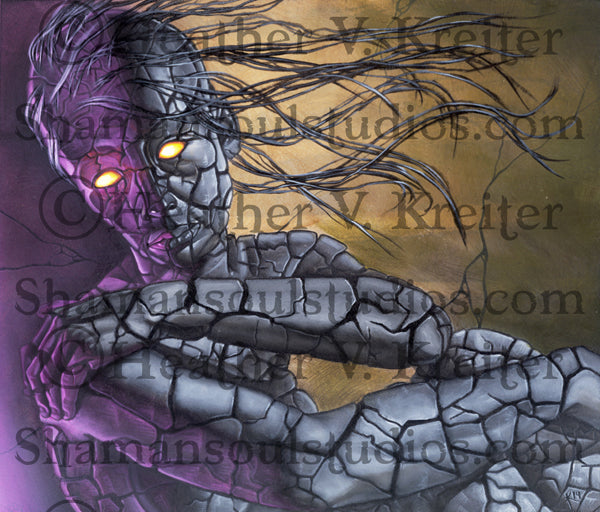From my description: “Saatet-ta was once a truly beautiful woman, but the Egyptian god Set’s rituals changed that for all time. She stands just over five feet tall , with a body that is a reflection of her twisted soul. She appears to be scorched in the way that long-term exposure to the sun burns a vampire. Her skin is blackened and cracked like a dried lake bed, and her once magnificent hair is a sparse tangle of steely gray. Saatet-ta’s eyes burn with a feverish light.”