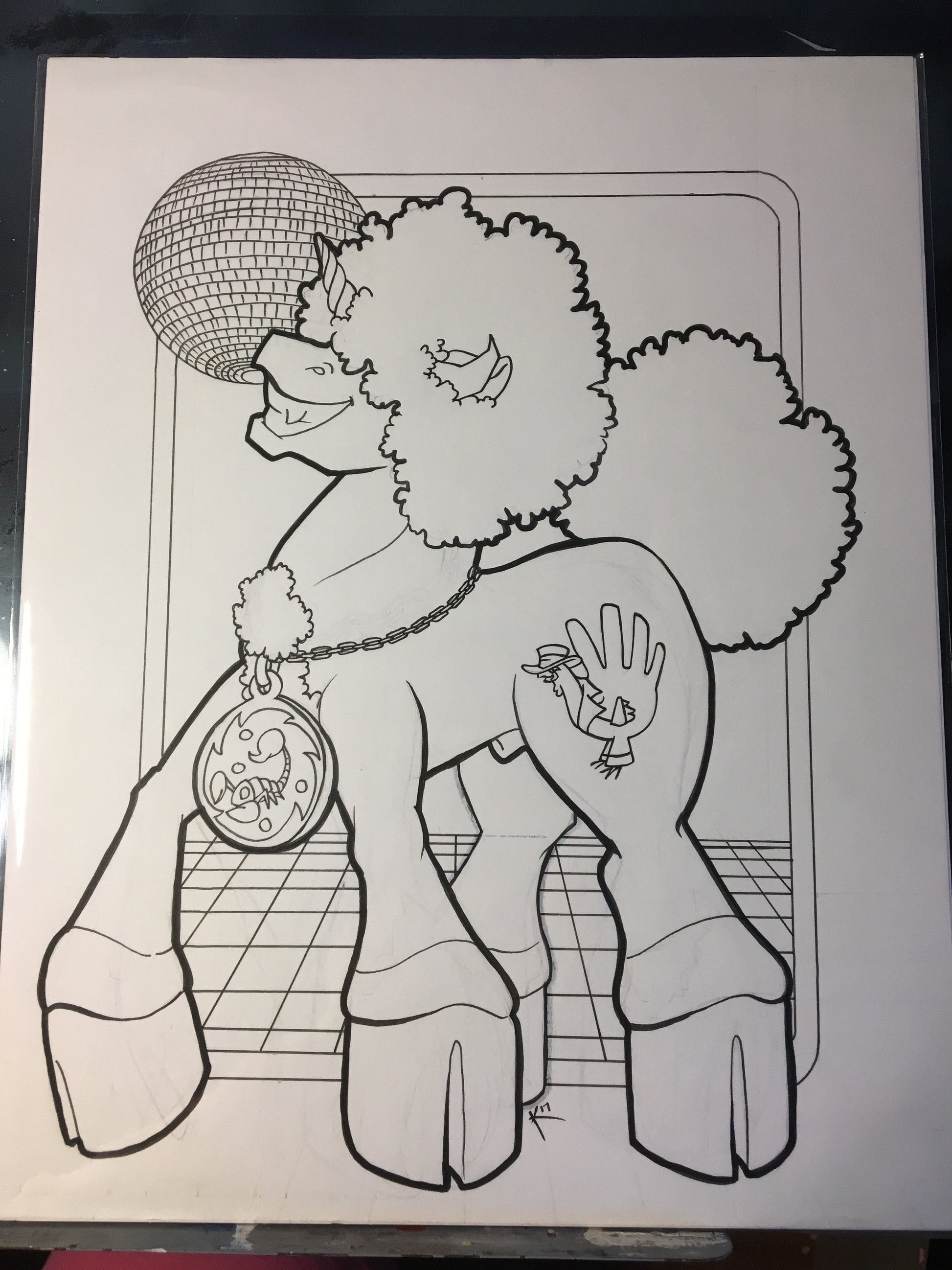 I had the idea for a 70s inspired, afroed, giant platform hooved Demon eons ago, but I couldn’t think of a damn name for it! One of my friends created a custom MLP with a hand turkey on its butt and “Jive Turkey” popped in my brain!