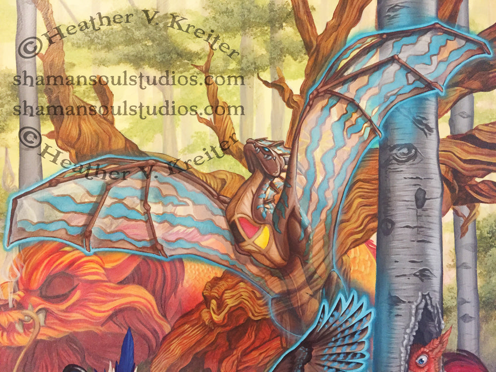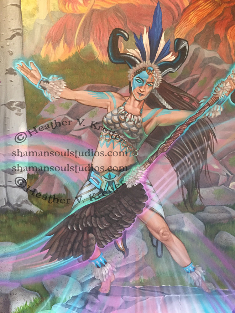 ~ At my first Origins in 2000 my main piece in the Art Show (and now my web presence name) was a painting called Shaman’s Soul . I wanted to continue in that theme for the cover. In this case though, my Shaman woman is summoning a Dragon Spirit.