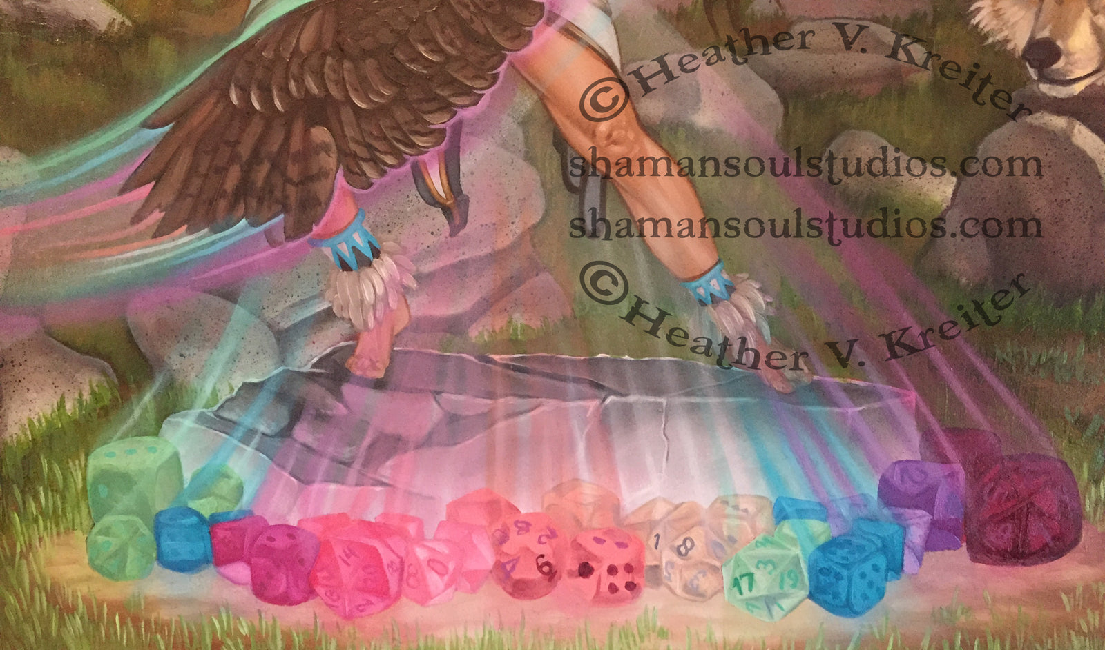 ~ Below the Shaman, are glowing “crystals” of various colors. The crystals are dice, and in the center, the numbers show 6 1 4 1 8 17 for the dates of the show .