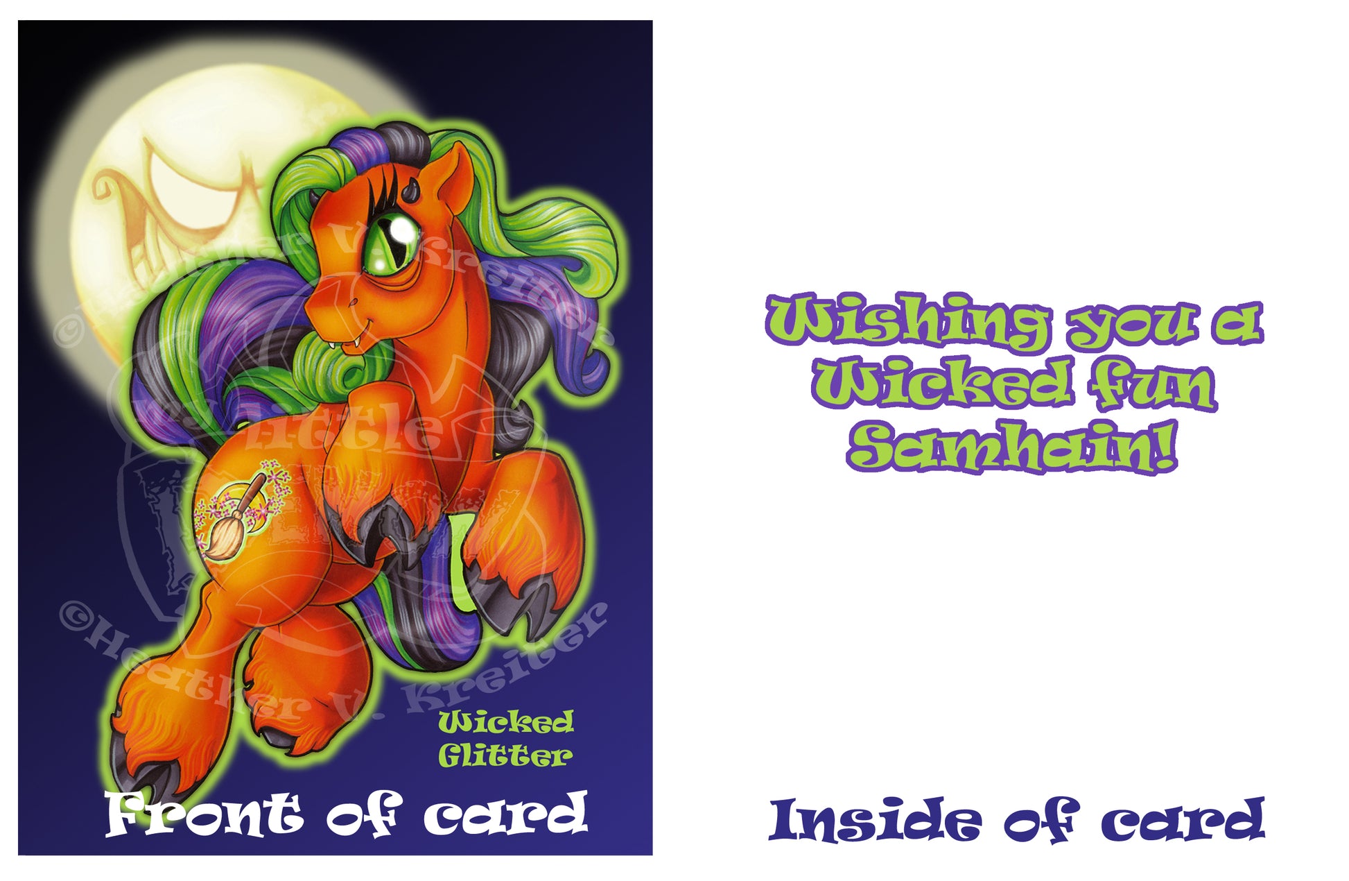 - The interior of the cards says either, “Wishing you a Wicked fun Halloween” or “Wishing you a Wicked fun Samhain”