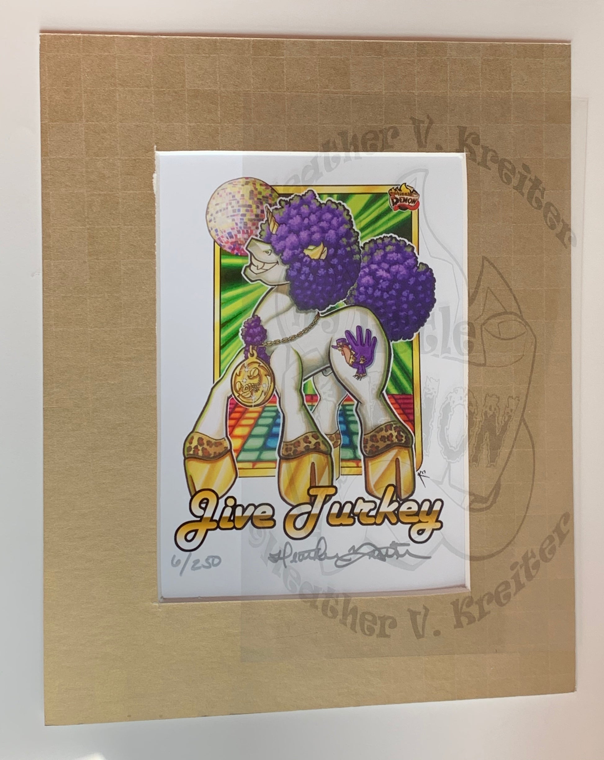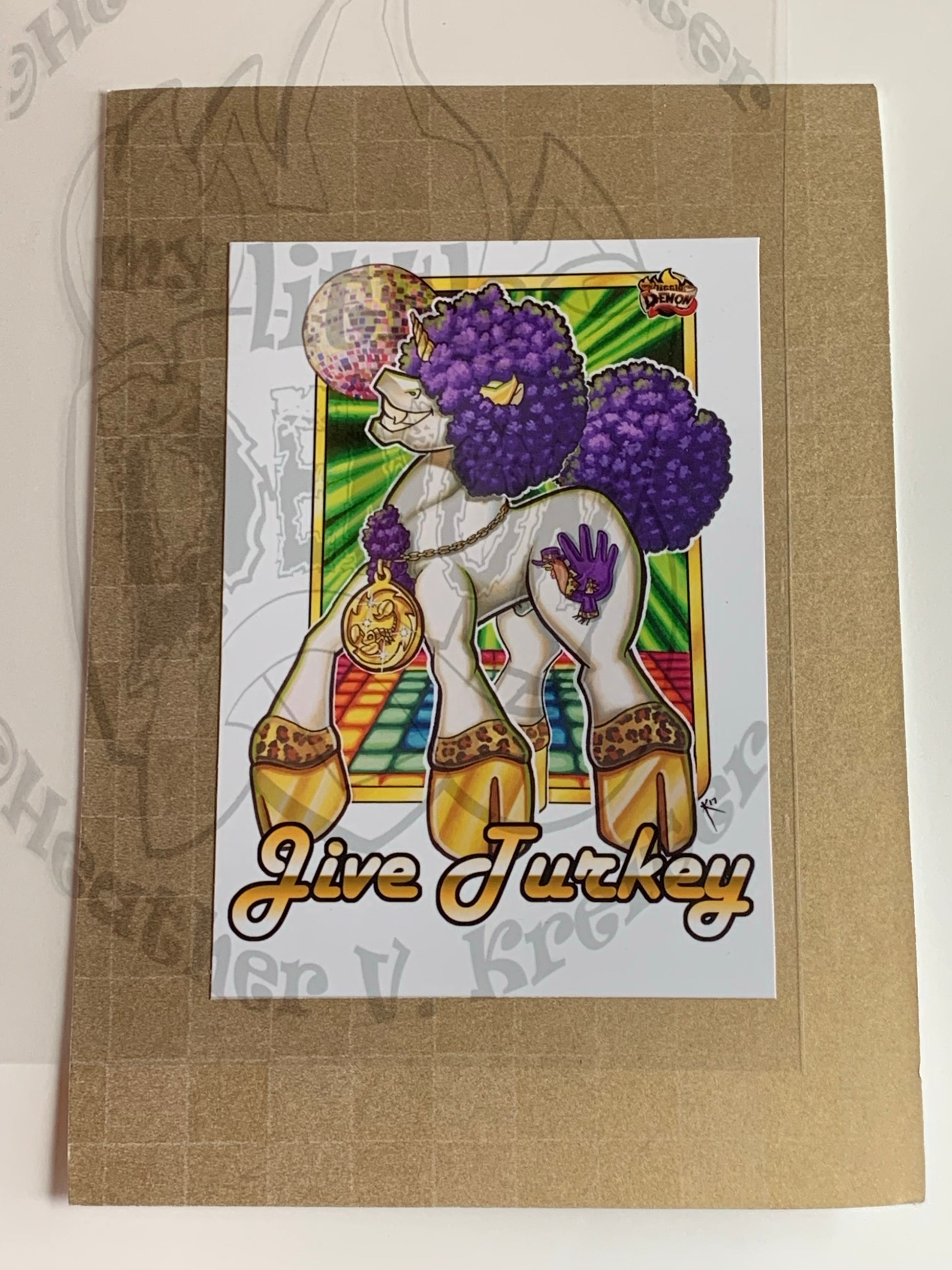 I had the idea for a 70s inspired, afroed, giant platform hooved Demon eons ago, but I couldn’t think of a damn name for it! One of my friends created a custom MLP with a hand turkey on its butt and “Jive Turkey” popped in my brain!