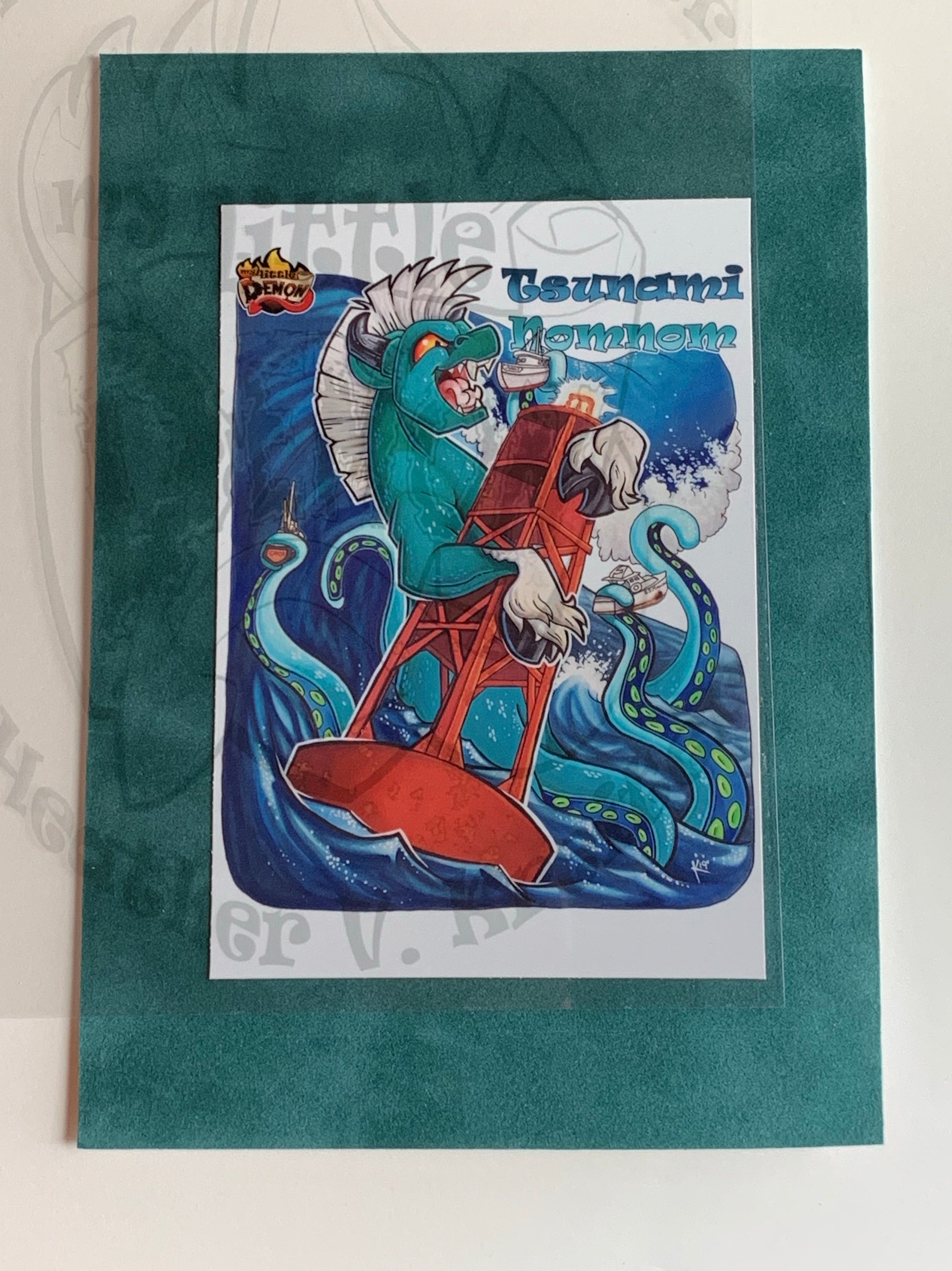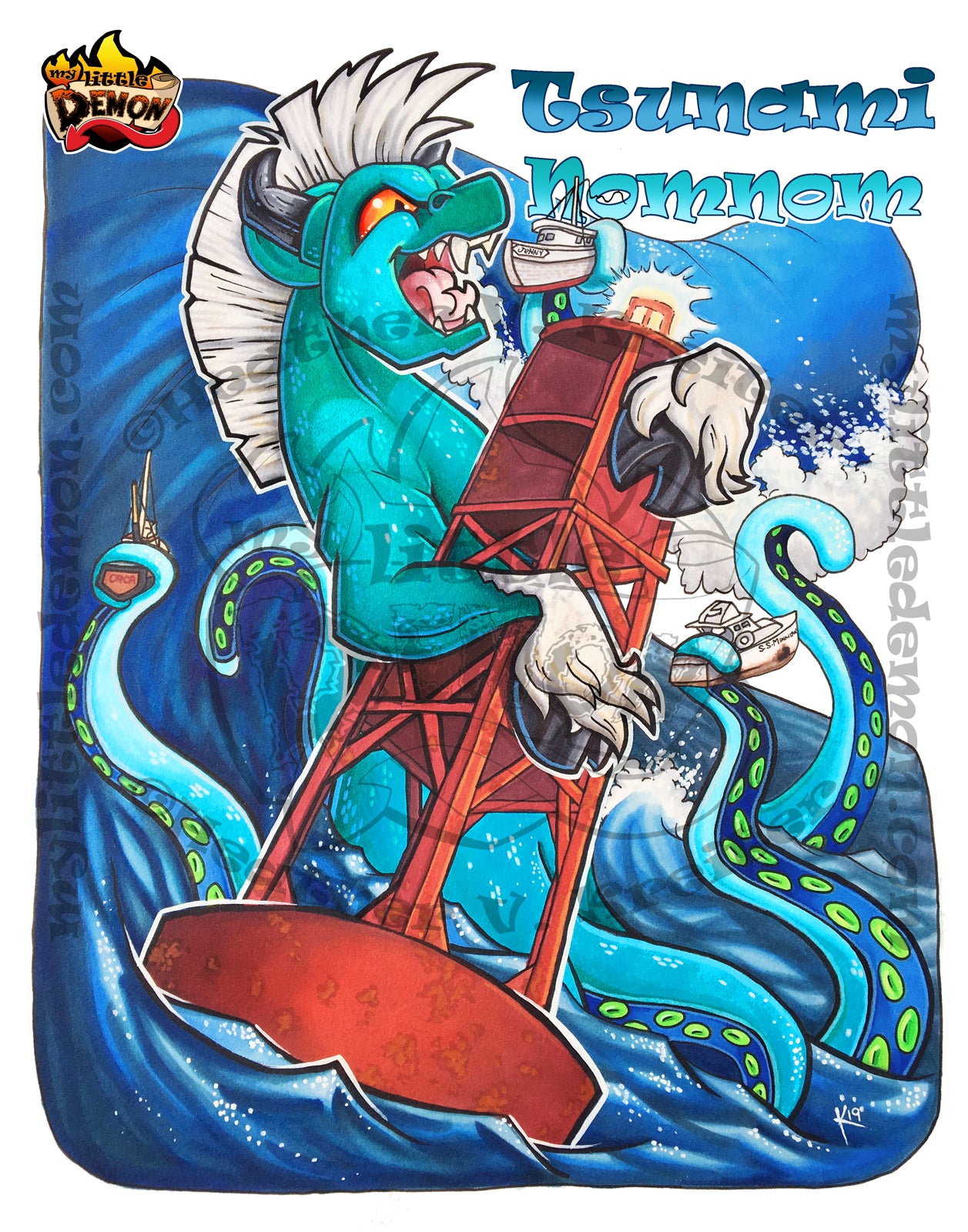 Tsunami Nomnom is one of my oldest ideas, but just never got around to creating him. He enjoys an afternoon snack of boats/ships and their occupants. He is seen here about to sample the Orca, Jenny, and S.S. Minnow.
