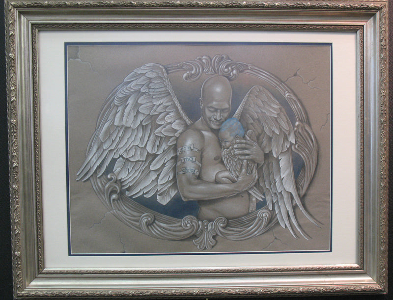 Divine Daddy: 16" x 20" double matted and framed to 28.5" x 22.5, Created in Markers, colored pencils, graphite and white charcoal on Canon Mi-Tientes paper