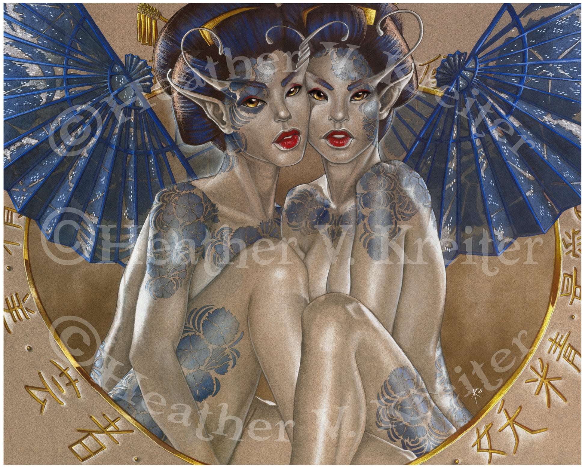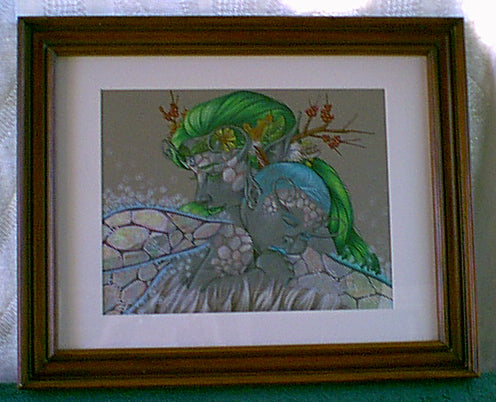 Faerie's Embrace: 11" x 14" Prismacolor Markers, colored pencils, graphite, and white charcoal on Canson paper, framed to approx. 16" x 20"