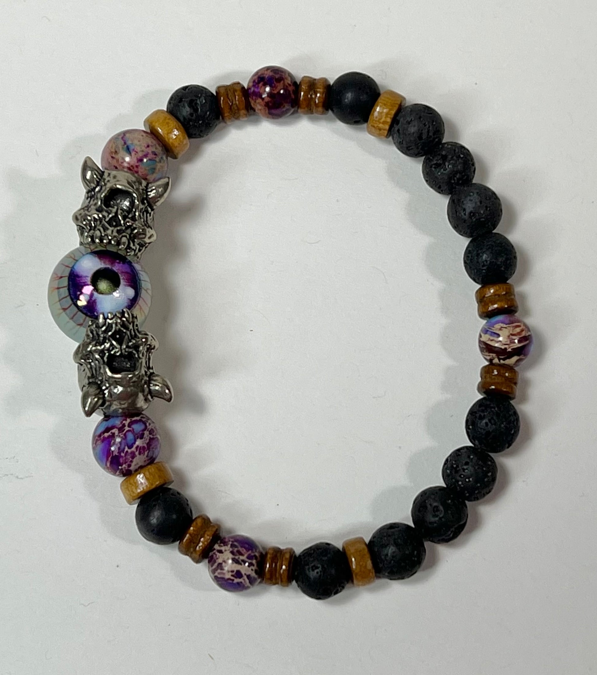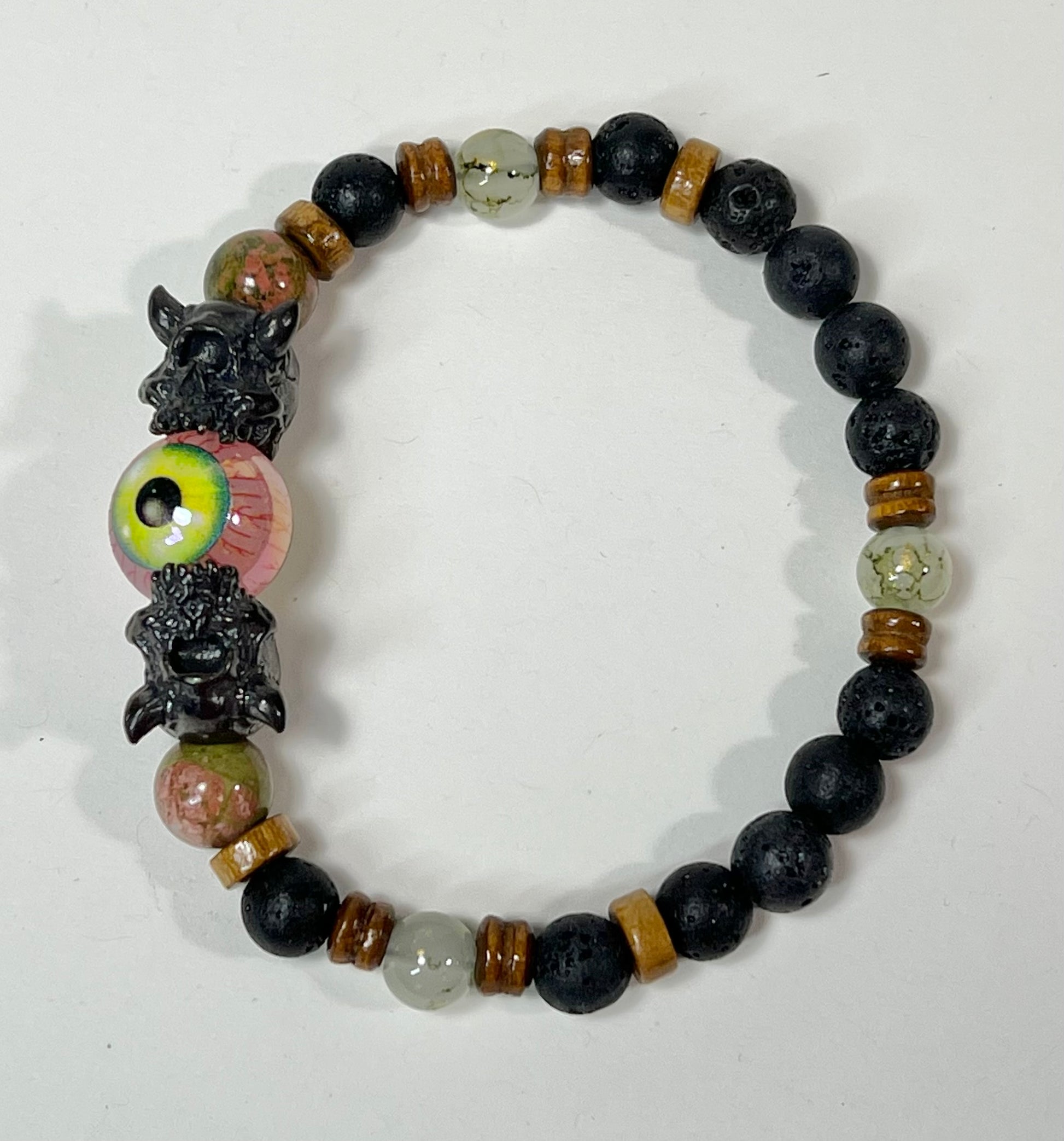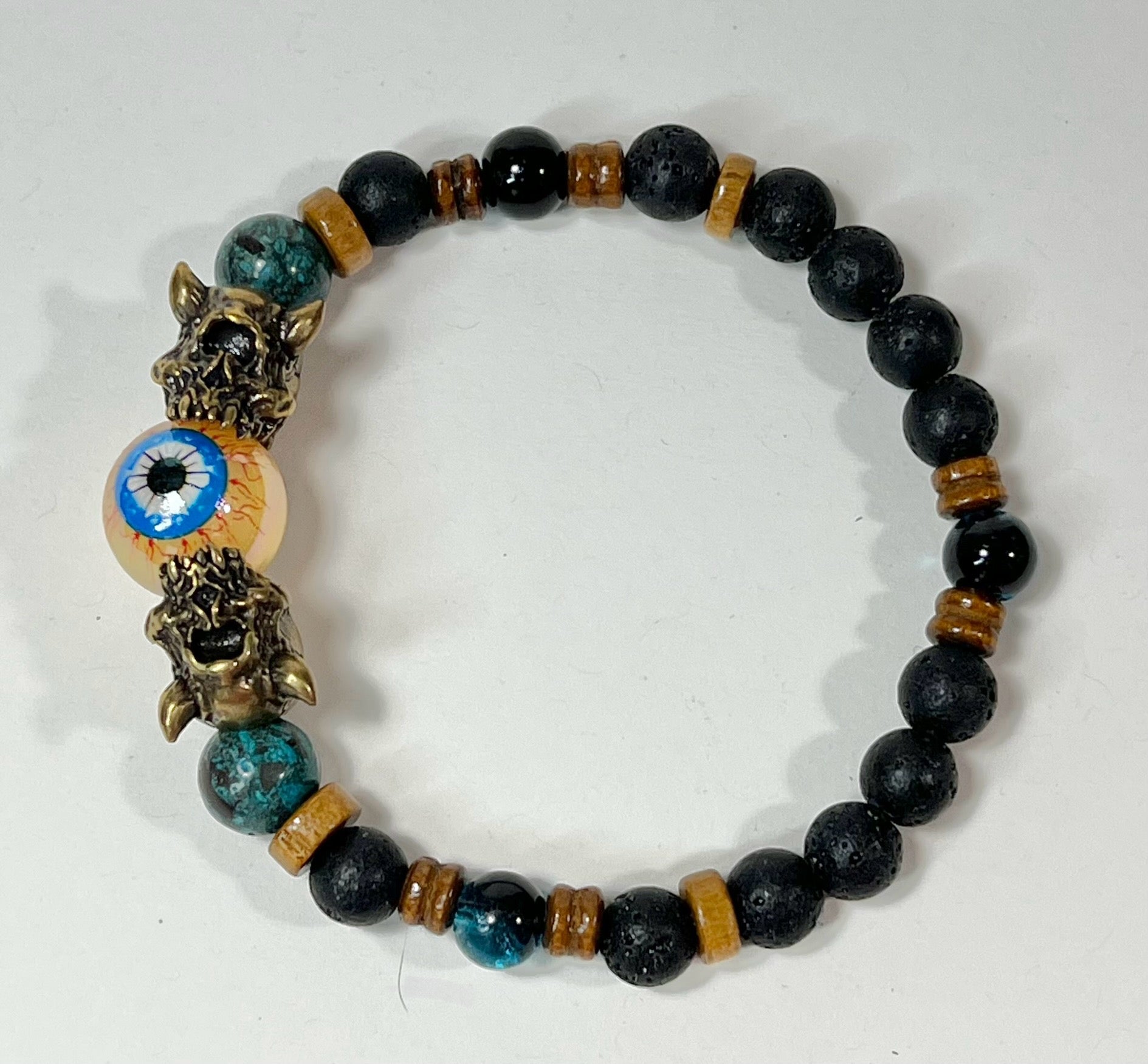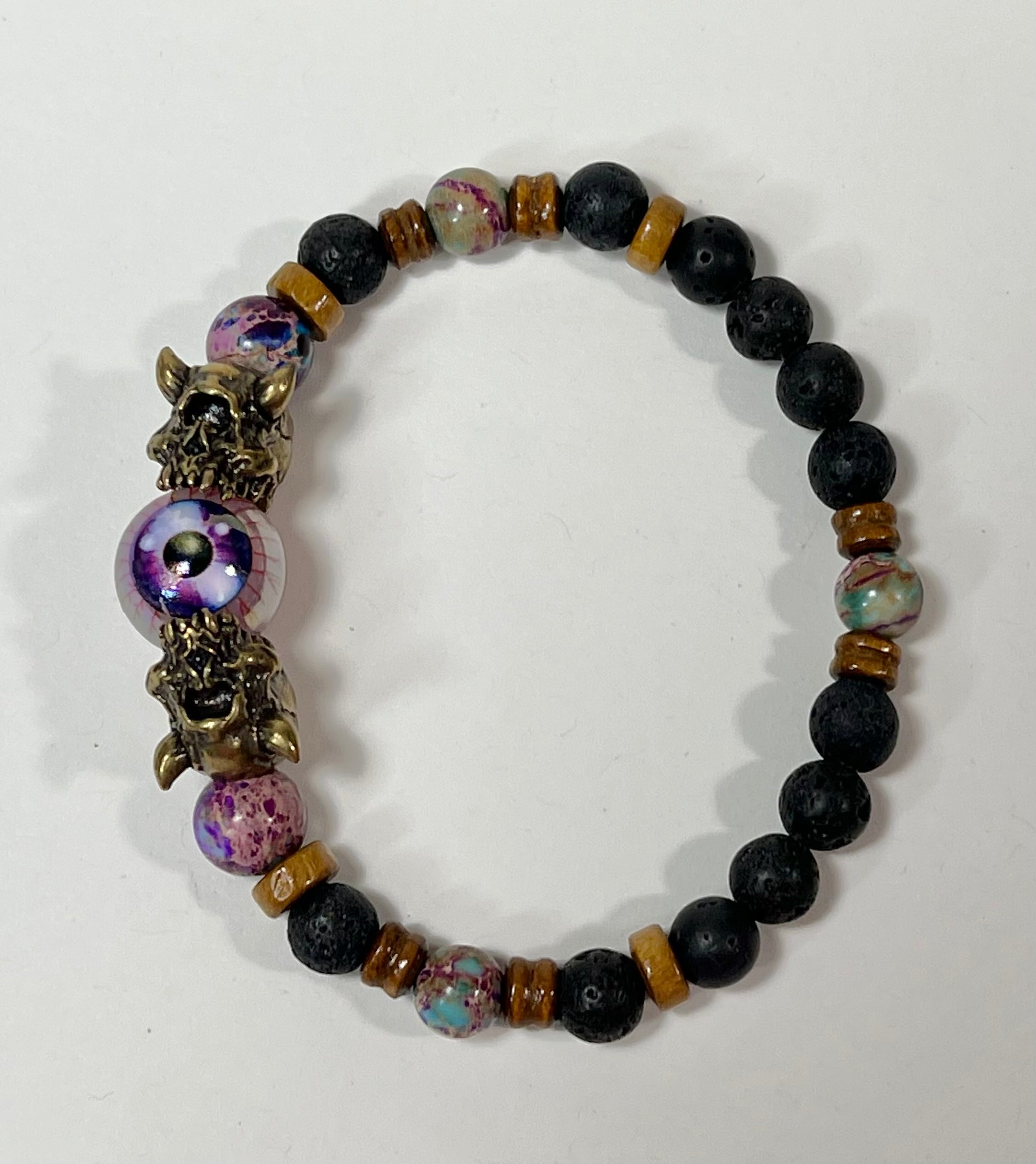 This bracelet features silver, gunmetal, and brass Cyclops beads as well as semi-precious stone beads.