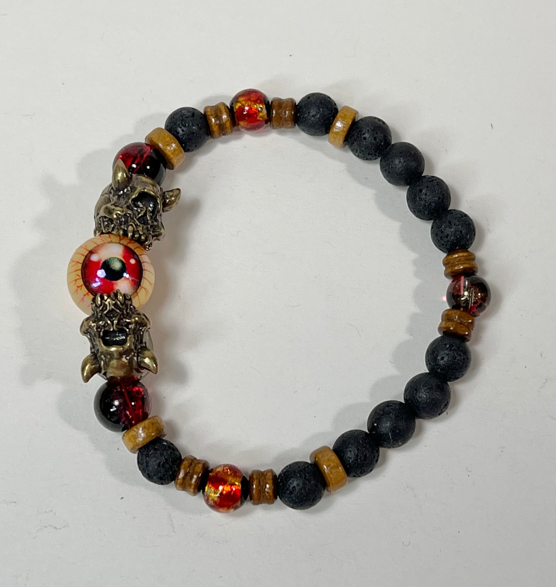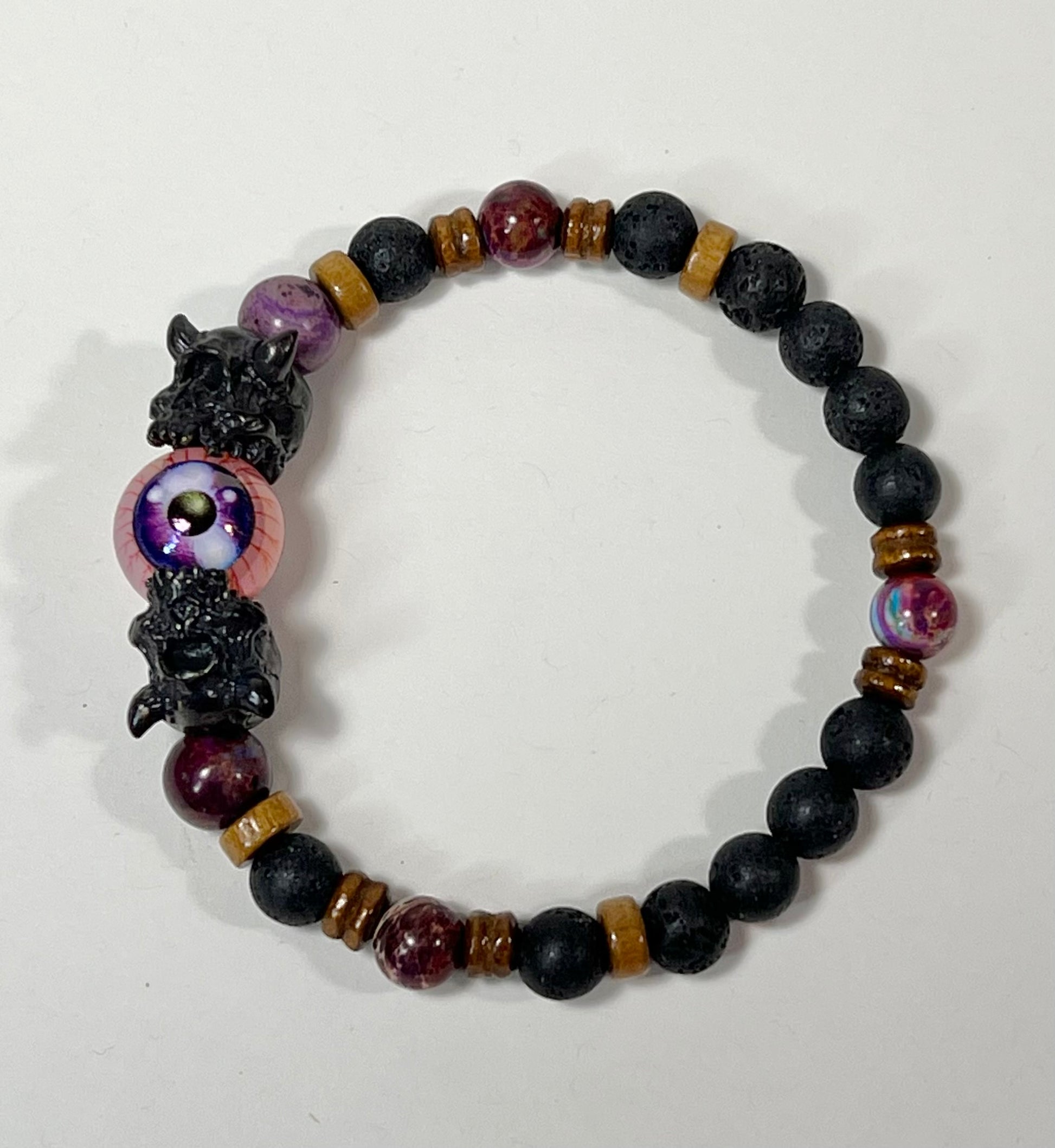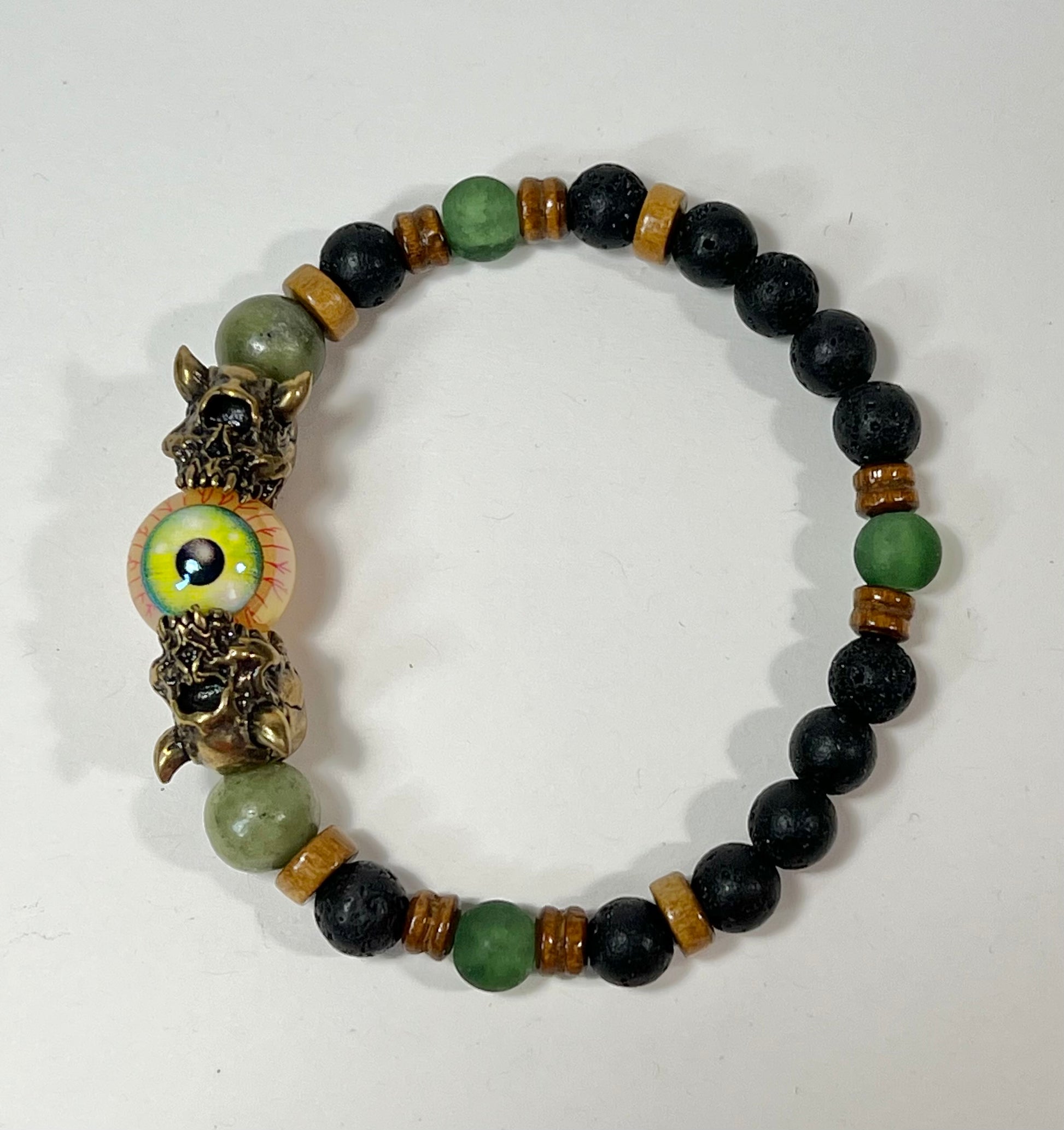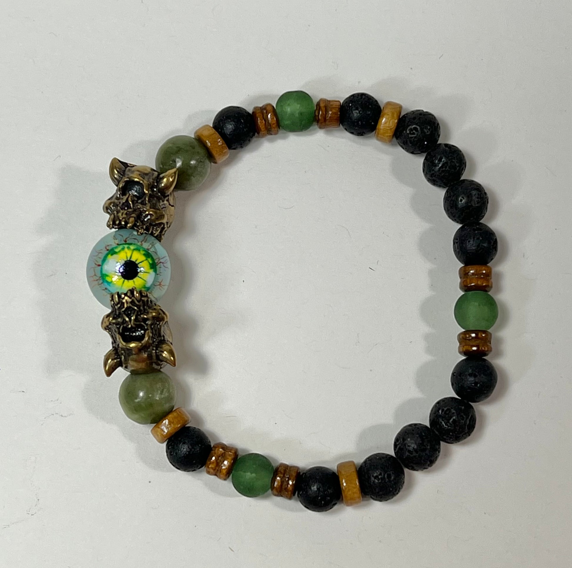This bracelet features silver, gunmetal, and brass Cyclops beads as well as semi-precious stone beads.
