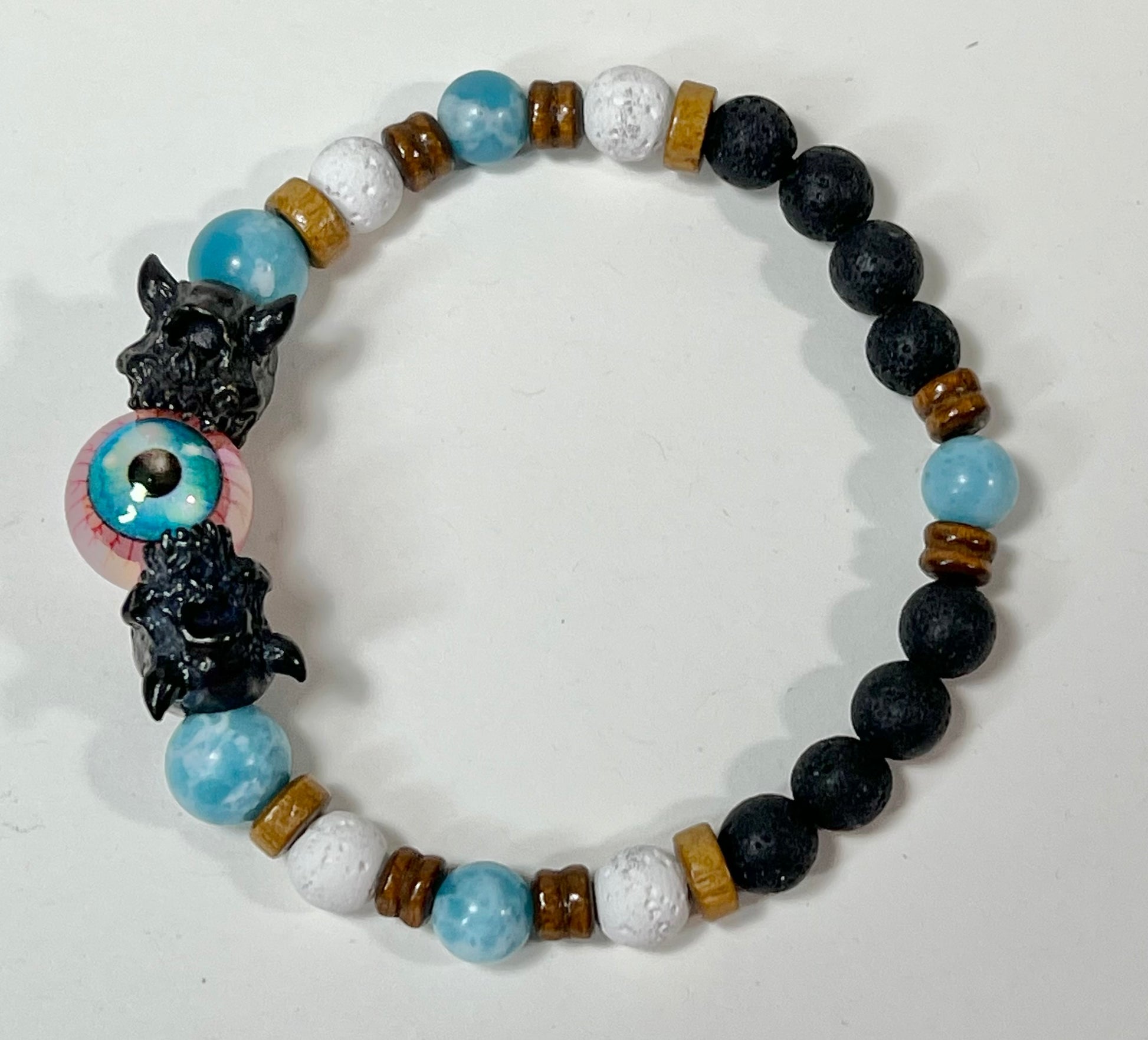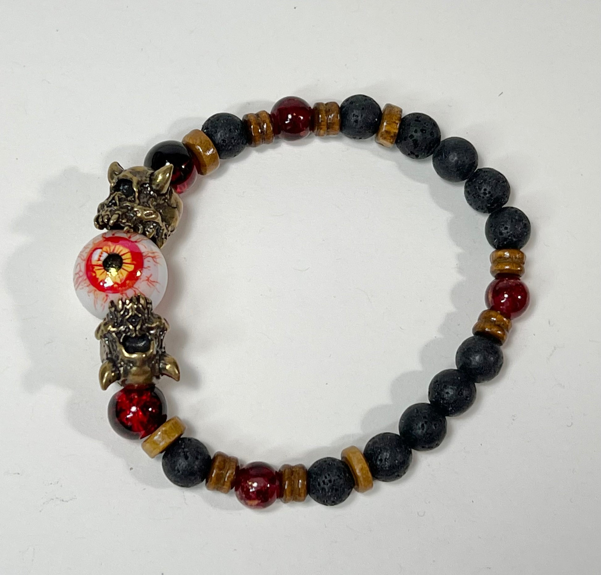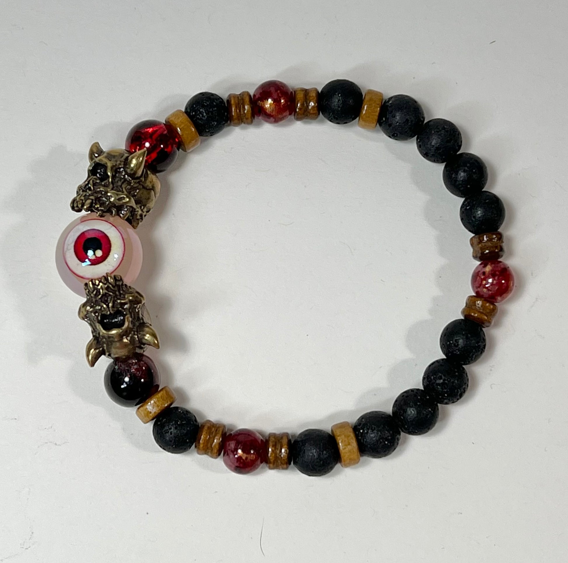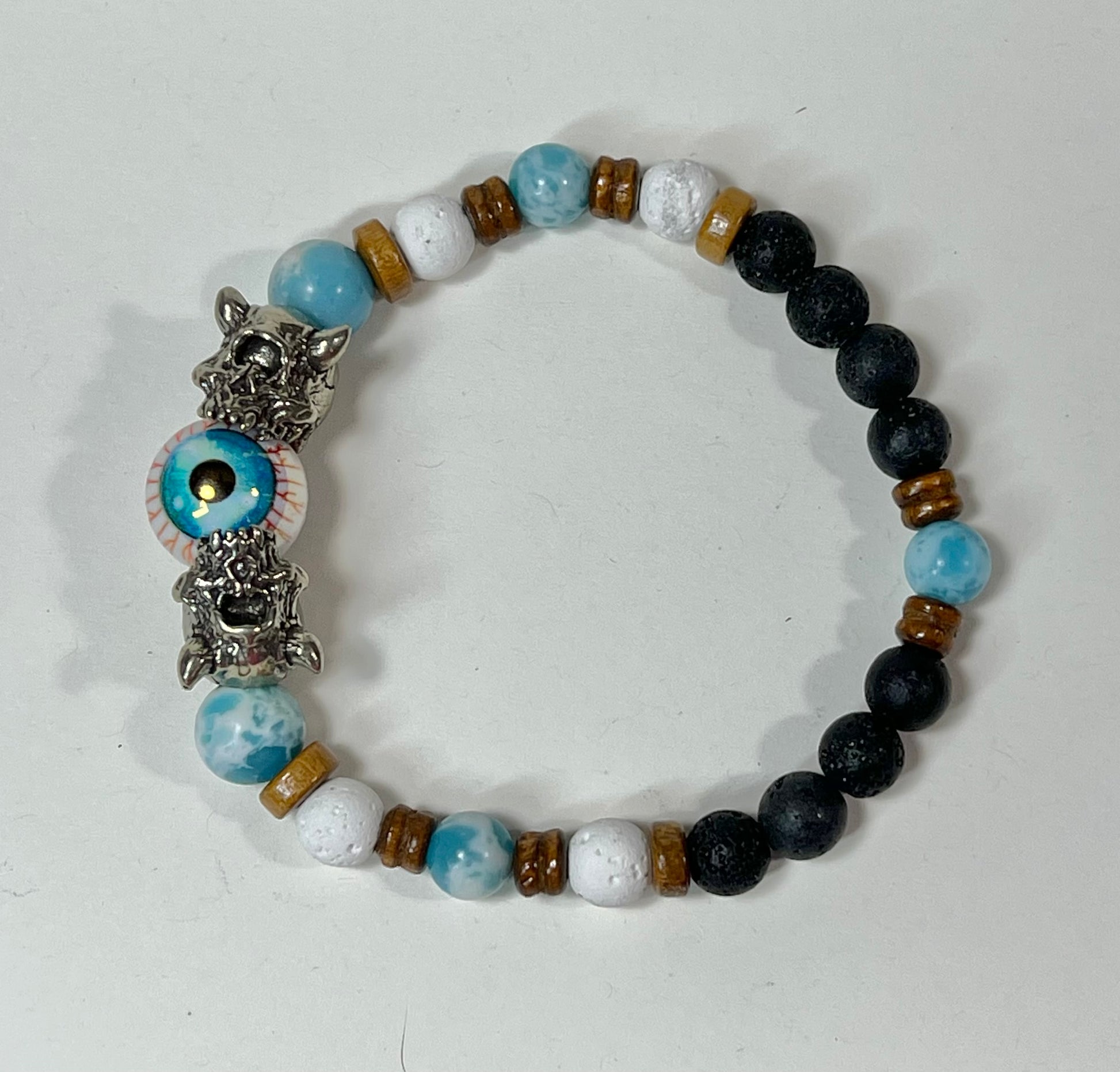 This bracelet features silver, gunmetal, and brass Cyclops beads as well as semi-precious stone beads.